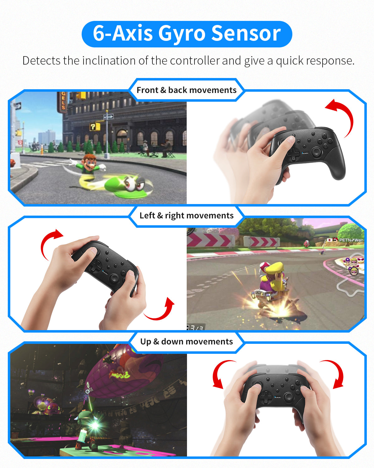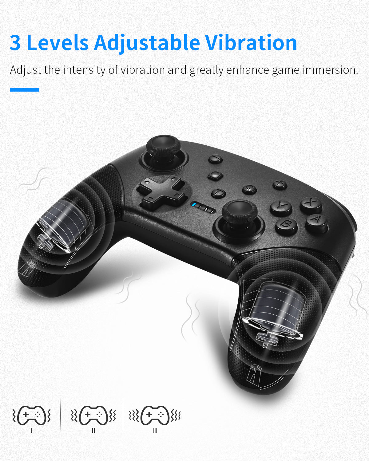 [ADJUSTABLE VIBRATE FUNCTION & GYRO SENSOR] Have 3 levels adjustable dual vibration motors that provide you excellent vibration feedback to enhance the game immersion. With the built-in 6-axis gyro sensor, this controller can detect the inclination of the controller and make a quick response, give you more fun while playing motion sensing games.